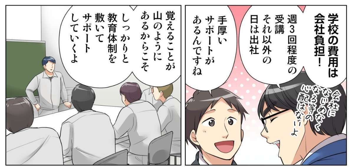まずは弊社の人材育成制度について、簡潔に紹介します。弊社では入社後、職業訓練施設である専門学校で学ぶことが可能です。確かな技術と資格を取得し、未経験からプロとして活躍するための制度なので、安心してスタートできます。